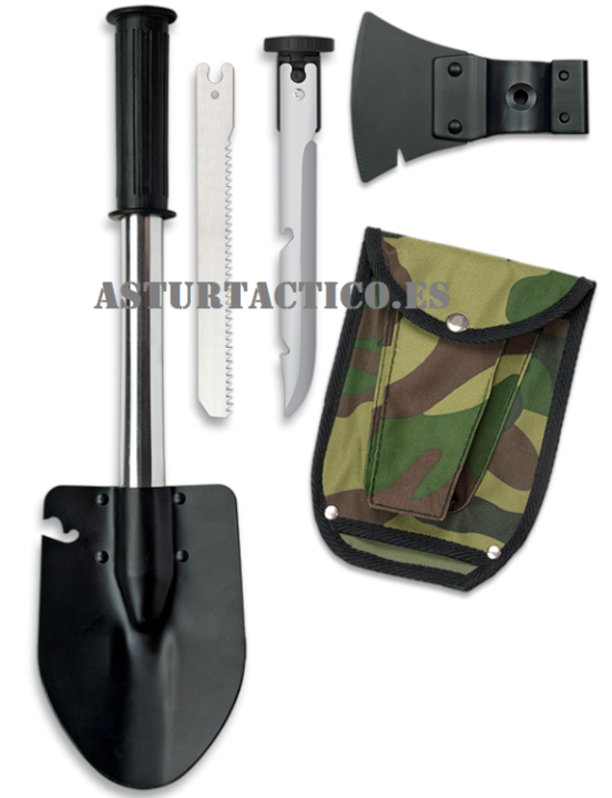 Pala desmontable, con cuchillo, sierra, hacha y funda de nylon. Medida total con pala: 43 cm y 772g
